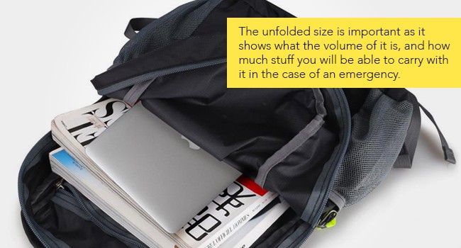 The unfolded size is important as it shows what the volume of it is, and how much stuff you will be able to carry with it in the case of an emergency.